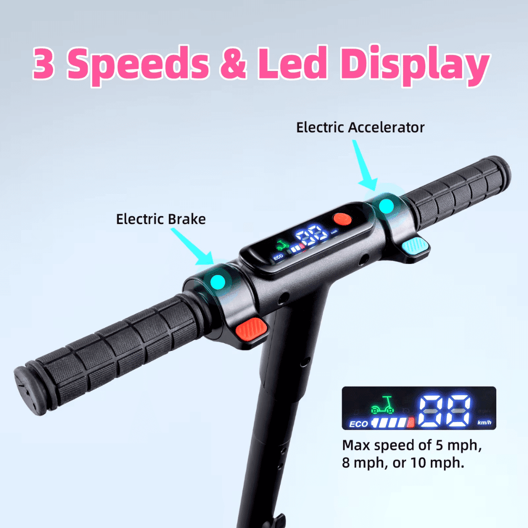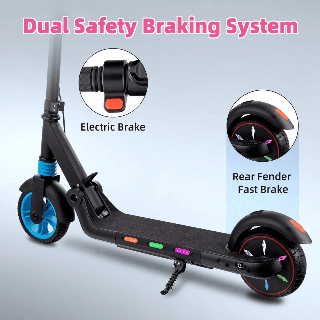 • فرامل الأمان: يحتوي السكوتر على نظام فرامل مزدوج يجمع بين الفرامل الميكانيكية وفرامل E-ABS الإلكترونية لضمان توقف آمن وسريع. هذا النظام يمنح الطفل ثقة إضافية أثناء القيادة، ويتيح له القدرة على التوقف السريع في حالات الطوارئ، مما يزيد من مستوى الأمان العام للسكوتر. تعرف على كيفية تجنب الحوادث الشائعة على السكوتر لضمان سلامة طفلك أثناء استخدامه.